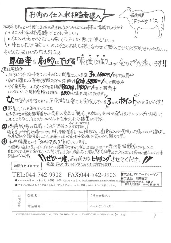 - 和牛経産ヒレ等級(関東スタイル)を月間60本、5,800円/kgで販売中